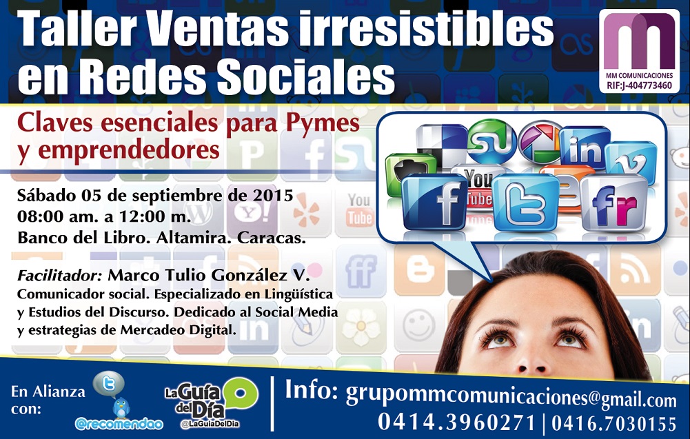 Marco González dictará el Taller Cómo hacer ventas irresistibles en Redes Sociales, organizado por Grupo MM Comunicaciones. La cita será el próximo 05 de septiembre en el Banco del Libro de Caracas. Los interesados en participar pueden escribir a [email protected] o comunicarse a través de los números 04143960271/0167030155.