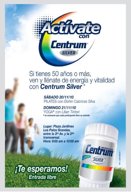 Pensando en el bienestar físico de las personas mayores de 50 años, Centrum promueve la campaña educativa “Actívate con Centrum Silver”, con la finalidad de ofrecer información oportuna a aquellas personas mayores de 50 años. Para dar inicio a las actividades de la campaña, se efectuarán dos días de actividades deportivas, completamente gratuitas, en los espacios de la Plaza Jardín de los Palos Grandes, para que todas las personas de 50 años o más que se animen a participar, se carguen de energía y vitalidad.