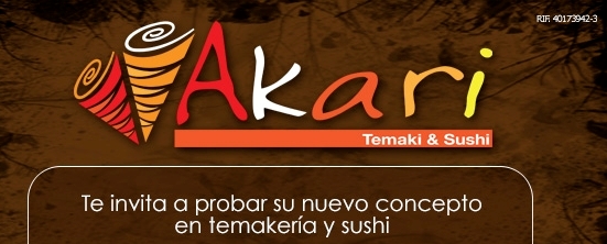 Akari Temaki. C.C. Líder, Nivel California, Paseo Boleíta. C.C. El Recreo, Nivel C2.