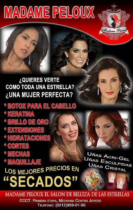 ¿Quieres verte como toda una estrella?, es la premisa de la imagen promocional de este nuevo espacio de la belleza integral, donde se ostentan figuras reconocidas como Alba Roversi, María Antonieta Duque, La Beba Rojas y Emma Rabbe, quienes, se vinculan a Alba Vallvé por la amistad y el trabajo en el medio artístico por muchos años. El horario de Madame Peloux es de lunes a sábado, de 9:00 AM a 7:30 PM. Teléfono: 0212-959.0195.