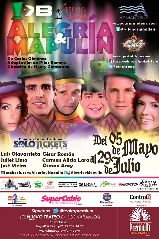 en los espacios del Teatro Premium Los Naranjos (Caracas), la obra infantil “Alegría y Mapulin” original de Carlos Giménez, con adaptación de Pilar Romero y dirigida por Henry Zambrano. La puesta en escena cuenta con un elenco de lujo, Juliett Lima, Carmen Alicia Lara, Cesar Román, Luis Olavarrieta, Osman Aray, José Vieria quienes dan vida a los personajes de esta hermosa aventura.