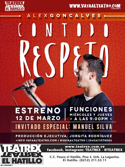 Con todo respeto se estrenará el miércoles 12 de marzo en Teatrex del centro comercial Paseo El Hatillo hasta el jueves 3 de abril. Las funciones se llevarán a cabo miércoles y jueves, a las 9:00 pm. Las entradas están a la venta en www.teatrex.com.ve y en las taquillas del teatro.