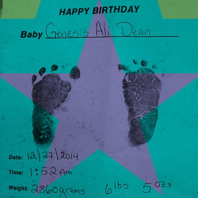 Alicia reveló la noticia en su cuenta de Instagram, donde publicó una foto con las huellas de los pies de Genesis y los datos de su nacimiento. El bebé nació a la 1:52 am del sábado 27 de diciembre de 2014 y pesó poco más de dos kilogramos.