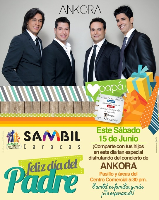 El grupo Pop Lírico Ankora celebra a los Padres en su día, con un recital de antología este sábado 15 de junio, en la Plaza Central del Centro Comercial Sambil (Municipio Chacao), desde las 5:30pm, en espacios abiertos del concurrido Mall capitalino.