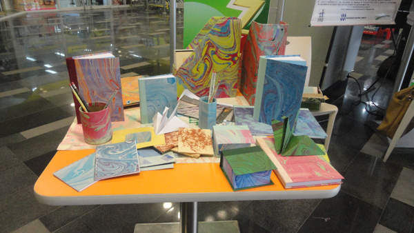 Entre los productos que se estarán exponiendo y vendiendo se encuentran: pliegos de papel o cartulinas de infinidad de colores y de múltiples formatos o tamaños con detalles marmoleados para el uso personal, encuadernación de libros y cuadernos con estos detalles multicolores, así como también tacos de notas, carpetas con ligas y carpetas sencillas con bolsillos internos, revisteros, bolsas de usos múltiples, porta lápices, entre otros. Además a esto, se realizarán talleres de dibujos para los niños.