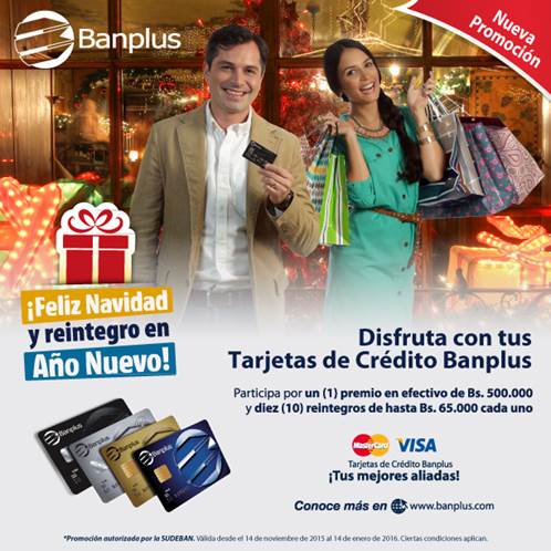 En esta temporada decembrina, caracterizada por las compras navideñas, Banplus invita a sus tarjetahabientes Visa y MasterCard Banplus a participar en esta promoción que les permitirá optar por un (1) premio en efectivo de Bs. 500.000 y diez reintegros de hasta Bs. 65.000 cada uno. Cada consumo de Bs. 5.000 que realice el cliente le generará un cupón electrónico con el que participará en el sorteo.
