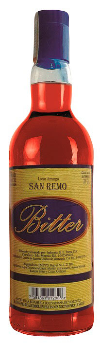 Este licor amargo, confeccionado con raíces, plantas y frutos secos macerados en ginebra, en la mejor y antigua tradición de los grandes aperitivos, constituye una experiencia única de sabores y aromas que preparan el cuerpo para una apetitosa comida. Suave, refrescante, tonificante y lleno de energía, el Bitter San Remo es elaborado por Central de Licores Unidos de Venezuela (Celiveca).