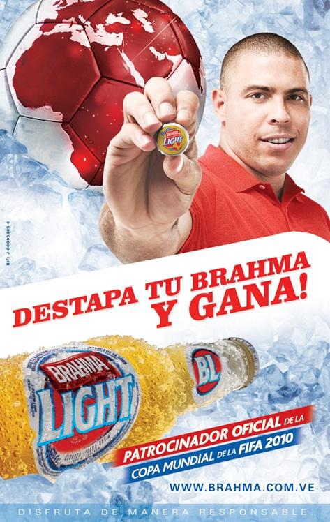 El aclamado futbolista brasilero Ronaldo, será la imagen de esta campaña con la que todos los fanáticos de Brahma Light y del fútbol tendrán la oportunidad de participar en el sorteo de dos pasajes, más acompañante, para viajar a la ciudad de Johannesburgo y vivir la emoción de dos partidos de octavos de final de la Copa FiFA 2010, con sólo registrarse en el portal www.brahma.com.ve antes del 10 de junio.