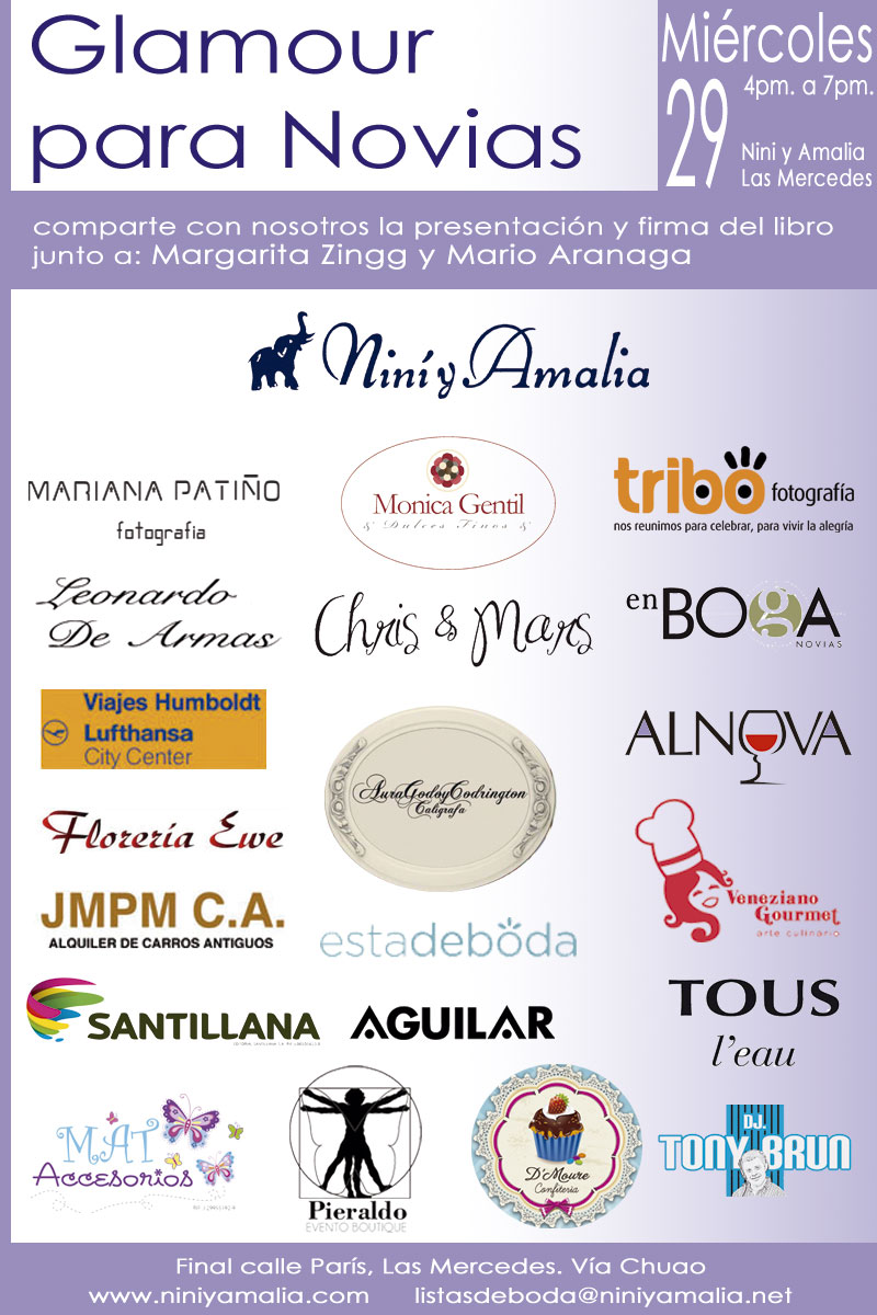 Margarita y Mario firmarán su libro Glamour para novias y ofrecerán un interesante, ameno y didáctico conversatorio acerca de todo lo relacionado con la planificación de una boda, desde la escogencia del vestido adecuado, la selección de regalos, estilo de decoración dependiendo del lugar y la hora, hasta cómo saber escoger el destino para la Luna de Miel.