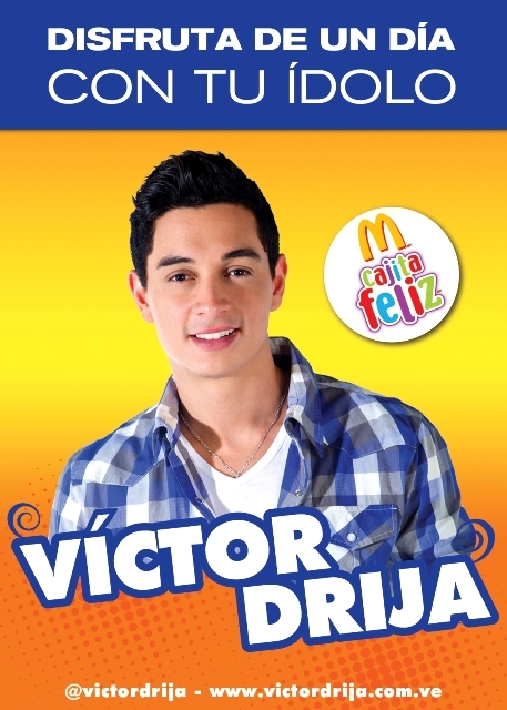 Caracas, octubre 2010.-  A partir del 8 de octubre y hasta el 12 de noviembre, con la compra de la Cajita Feliz, se entregará un cupón para participar en el nuevo concurso “Disfruta un día con tu ídolo”, de McDonald’s. El sorteo reunirá a cien ganadores en un almuerzo y concierto exclusivo con el cantante y actor venezolano Víctor Drija, mejor conocido por su papel protagónico en la serie musical adolescente “Somos tú y yo”.