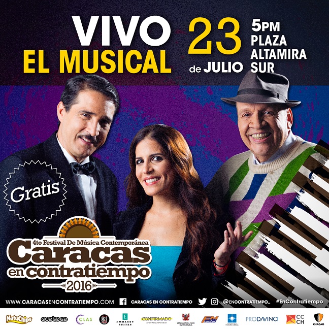 El Festival Caracas en Contratiempo 2016, que celebra la vanguardia de la música, arranca su programación con la presentación de Vivo, el musical y de La casa grande, dos espectáculos de altísimo nivel, de entrada libre, a realizarse en el ala sur de la muy conocida Plaza Altamira.