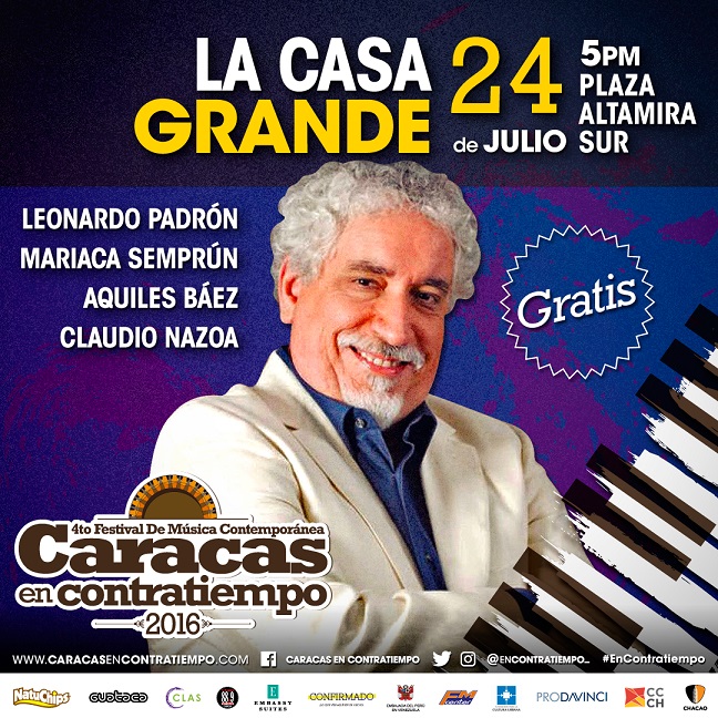 Caracas, 15 de julio de 2016.- Con dos espectáculos a cielo abierto se dará inicio a la cuarta edición del Festival Caracas en Contratiempo en la Plaza Altamira. En esta emblemática plaza caraqueña darán cita los artistas Cayito Aponte, Mariaca Semprún y Rolando Padilla para presentar Vivo, el musical, y Leonardo Padrón, Aquiles Báez, Claudio Nazoa y Mariaca Semprún para mostrar La casa grande. Esta celebración en torno a la música es posible gracias al apoyo de Cultura Chacao, Natuchips , FM Center.