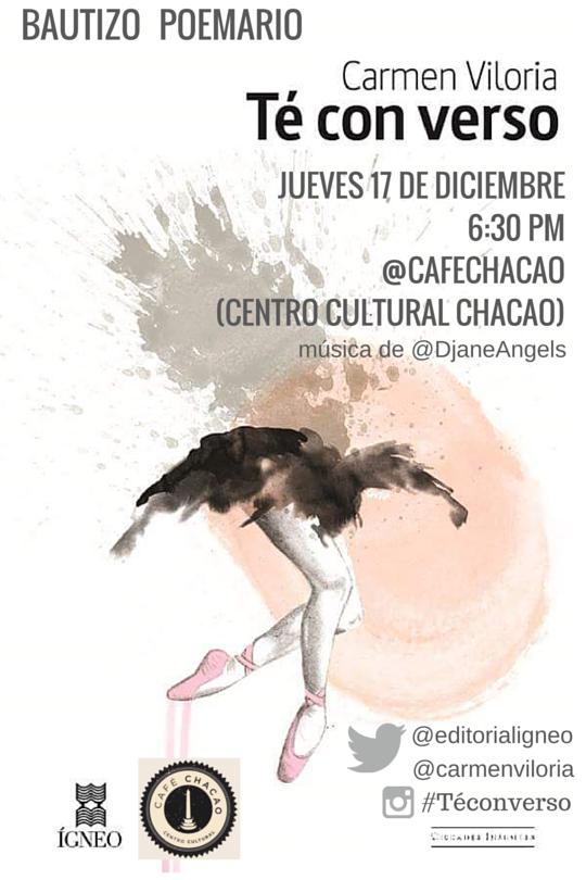 El próximo jueves 17 de diciembre a las 6:30 de la tarde, se llevará a cabo el bautizo de la primera publicación de la escritora Carmen Viloria, “Té con verso” a cargo de la Editorial Ígneo, en el Café del Centro Cultural Chacao.