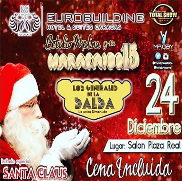 en el Salón Plaza Real del Hotel Eurobuilding. La Organización Mr. Oby y Total Show Entertainment, prometen una noche inolvidable donde los presentes podrán disfrutar en un evento totalmente familiar de: buffet internacional, guardería infantil, hora loca, zanqueros, parranda navideña y la participación especial de Santa Claus.