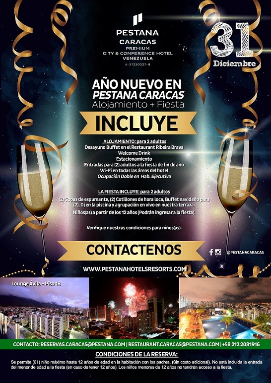 Por último, la fiesta AÑO NUEVO 2016 Pestana es un evento exclusivo para 150 personas (previa reserva) que se realizará en el Lounge Ávila del piso 18 que incluye: una copa de espumante, buffet navideño, descorche permitido, Dj en la piscina: agrupación en vivo en la terraza, cotillón para la Hora Loca, acceso a niños mayores de doce (12) años con un costo por persona de Bs. 20.160,00.