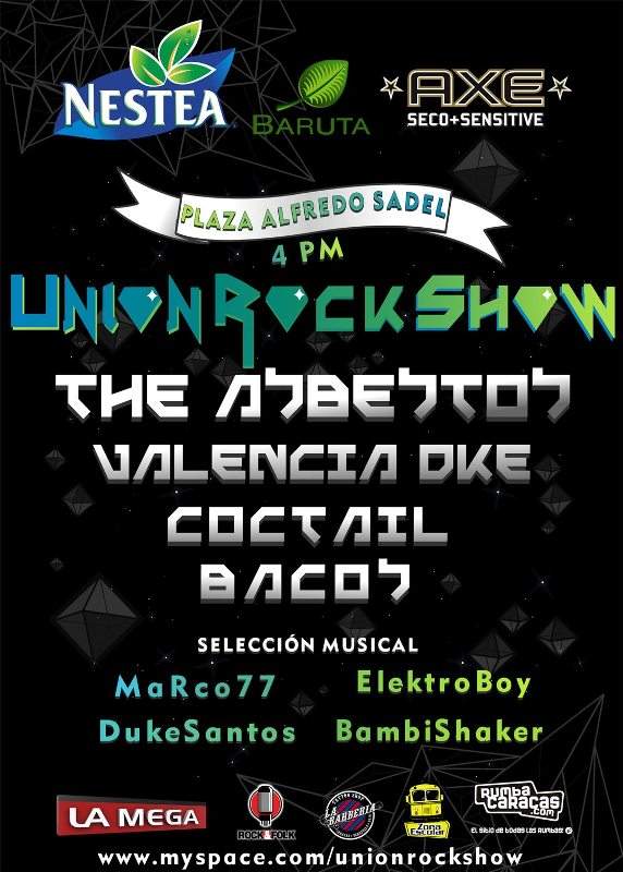 El público podrá disfrutar del Ciclo Union Rock Show 2010, el sábado 13 de marzo a partir 5:00 p.m., en la Plaza Alfredo Sadel, con el patrocinio de Nestea, Axe, La Mega, Zona Escolar, Rumbacaracas, La Barberia Tattoo y Rock and Folk. La entrada es libre.