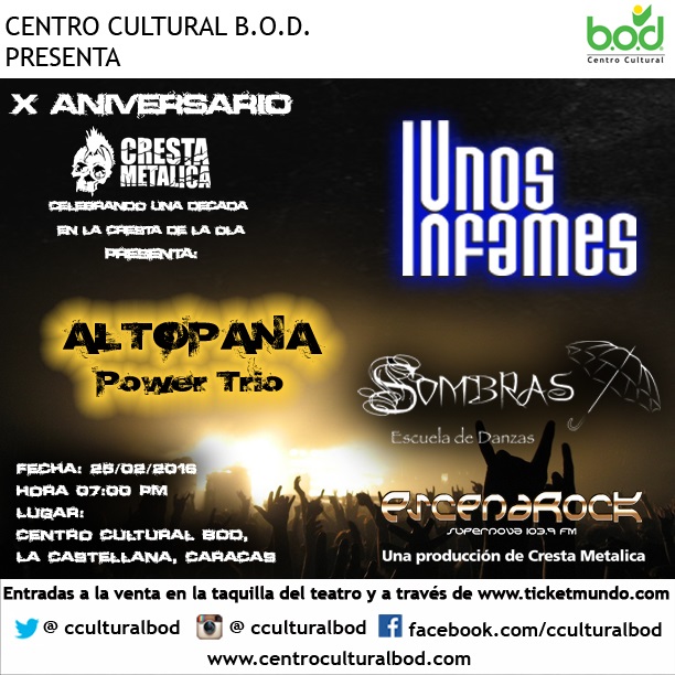 Cresta Metálica cumple 10 años de labor ininterrumpida y lo celebra por todo lo alto con un concierto especial que tendrá lugar el jueves 25 de febrero a las 7:00 pm en el Centro Cultural BOD de La Castellana. El evento contará con la actuación de las agrupaciones AltoPana Power Trio de Caracas, Unos Infames de Puerto La Cruz y de la Academia de Danzas Sombras, combinando así la música rock con la danza tribal. Además será una noche de muchas sorpresas.