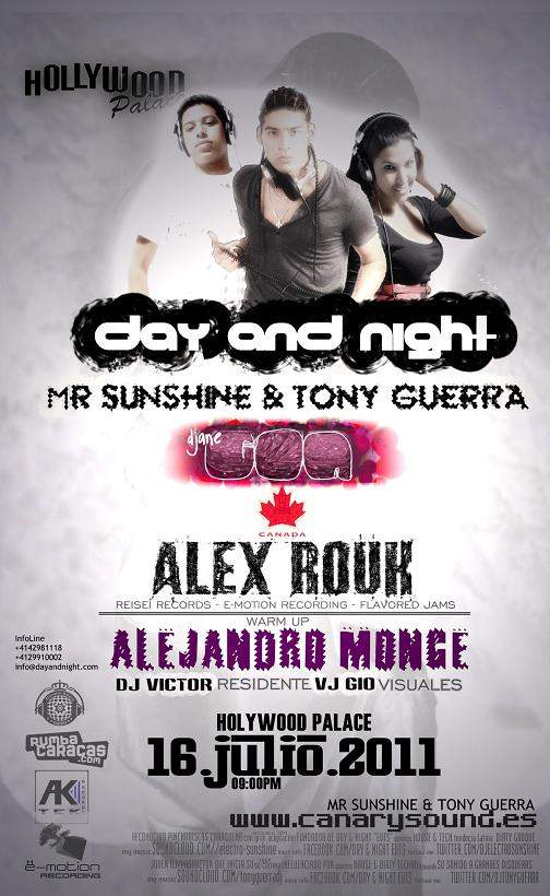 A partir de las 9 de la noche, el Day & Night Special Party II, dará inicio con un atractivo ambiente musical del que estará a cargo Alejandro Monge Dj y productor Venezolano e invitado especial, quien también se encontrara acompañado de la bella y sexy Djane Goa, talento nacional quien hasta hace poco finalizo su tour “TORONTO 2011”.