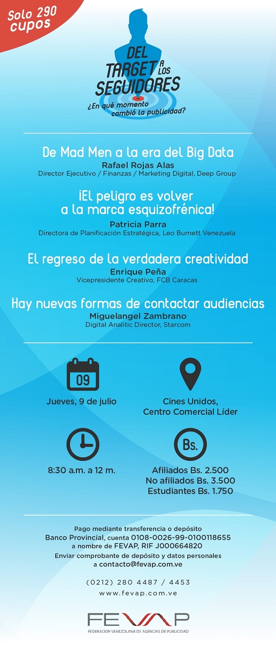 Basándose en lo anterior, y para poder ahondar más en estos temas y entender a la publicidad actual y las tendencias modernas en las formas de comunicación con las que se maneja, La Federación Venezolana de Agencias de Publicidad (FEVAP), organiza y llevará a cabo una interesante charla titulada: “Del Target a Los Seguidores: ¿En Que Momento Cambió La Publicidad?” que se realizará el jueves 9 de julio desde las 8:30 am en Las instalaciones de Cines Unidos del Centro Comercial Líder, en La California, Caracas. La misma estará destinada a estudiantes, profesionales y medios de comunicación.