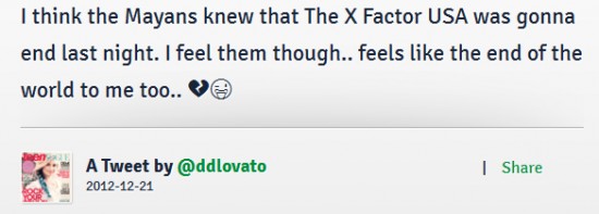 ‘Creo que los mayas sabían que ‘The X Factor USA’ iba a terminar anoche. Se siente como el fin del mundo para mí también’, expresó Demi Lovato con pesar en el corazón.