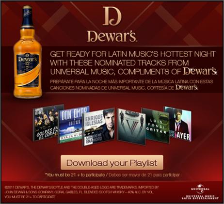 Los seguidores, mayores de 21 años de edad, podrán ingresar a la página de Facebook de Dewar’s y al hacer click en “Me Gusta”, tendrán acceso a una de las dos listas de canciones que podrán descargar de forma gratuita, al igual que otros contenidos exclusivos, de los nominados a estos premios, entre ellos: Enrique Iglesias (incluye dos canciones, una de ellas junto con Juan Luis Guerra), Don Omar, Los Tigres de Norte con Paulina Rubio, Wisin y Yandel y Luis Fonsi.