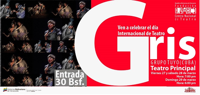(Prensa CNT 23/03/2015) Con el fin de fortalecer los lazos y el intercambio cultural en el ámbito internacional, el Centro Nacional de Teatro en el marco del Convenio Cuba-Venezuela, llevará al escenario la obra teatral “Gris”, una producción cubana de la agrupación Teatro Tuyo, que tendrá función en el Teatro Principal de Caracas este viernes 27 de marzo a las 7 de la noche, con motivo de la celebración del “Día Mundial del Teatro” decretado hace 54 años por el Instituto Internacional del Teatro (ITI) de la Unesco.