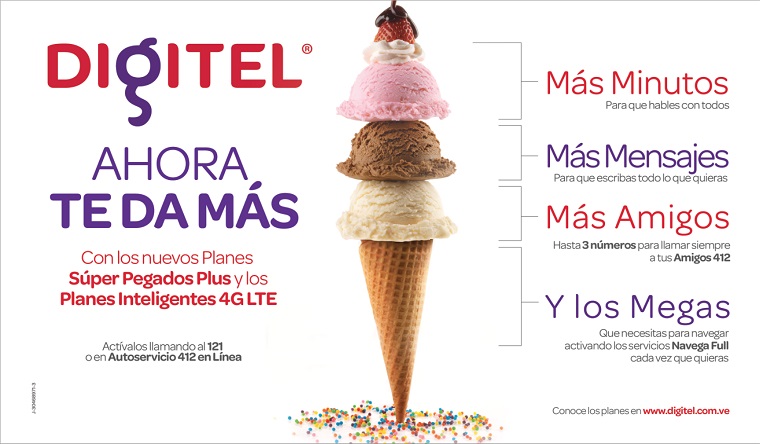 Con la incorporación de nuevos planes y la disposición de más opciones para el manejo de los servicios, Digitel ratifica el compromiso con sus usuarios y con todos los venezolanos al ofrecer la mejor oferta de servicios en tercera y cuarta generación, posicionándose como la empresa más innovadora del mercado de las telecomunicaciones en Venezuela.
