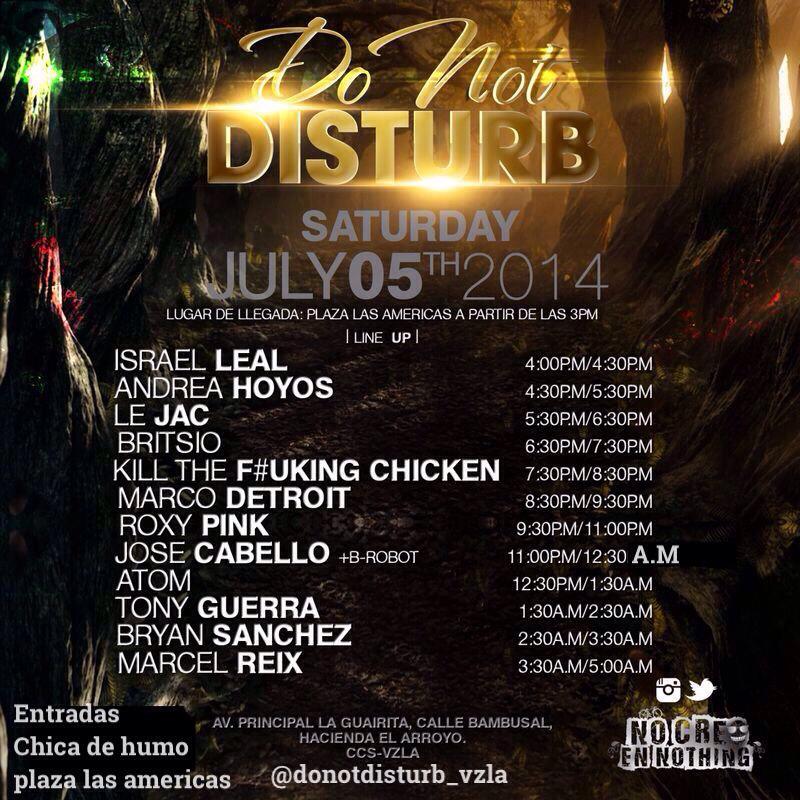 Los beats del Electro, House, Progressive, ElectroHouse Progressive, Tech House y todas sus variantes sacudirán la ciudad capital en el lanzamiento de estas innovadoras marcas que llegan al mercado venezolano para distinguir al diverso amante de la música electrónica. Personalidades y medios de comunicación, se darán cita en el lanzamiento al mercado de “Do Not Disturb”, “Rave LifeStyle” y “No creo en Nothing”, disfrutando de las mezclas de Israel Leal , Andrea Hoyos; le Jac, Britsio, Kill The F#uking Chicken, Marco Detroit, Roxy pink José Cabello + B-Robot, Atom, Tony Guerra, Bryan Sanchez y Marcel Reix, en una celebración por todo lo alto que promete mantener el nivel y la energía de los asistentes con alucinantes sorpresas y la más alta sonoridad, donde el código de vestimenta lo ponen las marcas en lanzamiento.