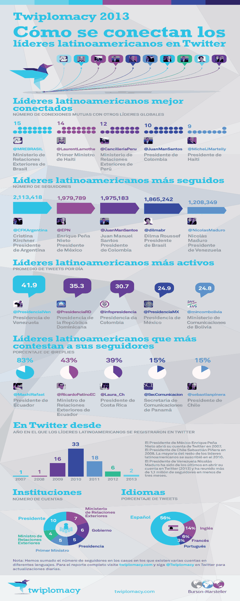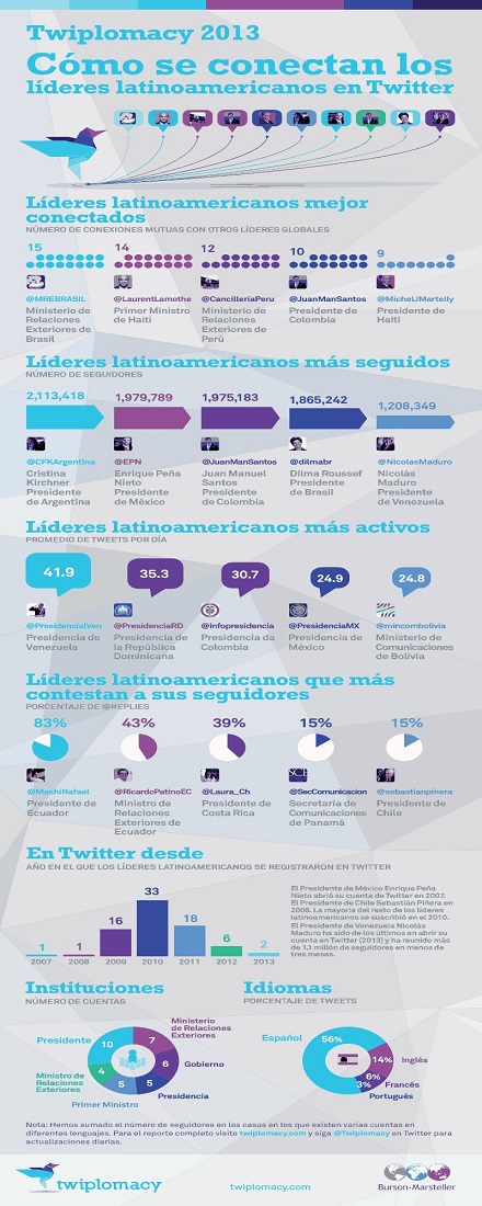 “Twiplomacy” es un estudio líder en su tipo, que tiene como objetivo identificar hasta qué punto los líderes mundiales usan Twitter. A comienzos de julio de 2013, Burson-Marsteller analizó 505 cuentas de gobiernos en 153 países para el desarrollo de este análisis.