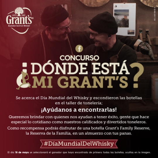 Reafirmando que “el éxito sabe mejor al compartirlo”, la marca escocesa lanza en Facebook “¿Dónde está mi Grant’s?”, un concurso que no está atado a ninguna promoción o compra en el punto de venta, sino que para participar basta darle like al fan page de Grants Whisky Venezuela (http://bit.ly/1RAGoxa), compartir una imagen que tiene oculta varias botellas usando el hashtag #DiaMundialDelWhisky, y descubrir el mayor número de ellas. La persona que logre revelar en dónde están todas las botellas, participa en un sorteo para ganar y disfrutar de un Grant’s Family Reserve en un reconocido restaurante de su ciudad en compañía de uno, dos o tres amigos que en le han ayudan a progresar y tener éxito.