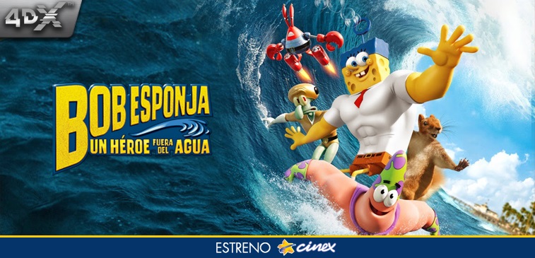 Desde el fondo del mar directo a las pantallas de Cinex, llega la segunda película del personaje marino más querido por niños y adultos: “Bob Esponja: Un héroe fuera del agua”. La cinta narra las nuevas aventuras de Bob y sus inseparables amigos, que los llevará a la superficie para ir en la búsqueda de la famosa receta de la cangreburger, que ha sido robada. La producción dirigida por Paul Tibbitt cuenta con una mezcla de animación y escenas reales. El actor español Antonio Banderas interpreta en carne y hueso al temible pirata “Barba Burger”. Esta cinta es una opción ideal para disfrutar en familia y con espectaculares efectos especiales en las salas 4DX del Centro San Ignacio, Paseo El Hatillo y El Recreo.