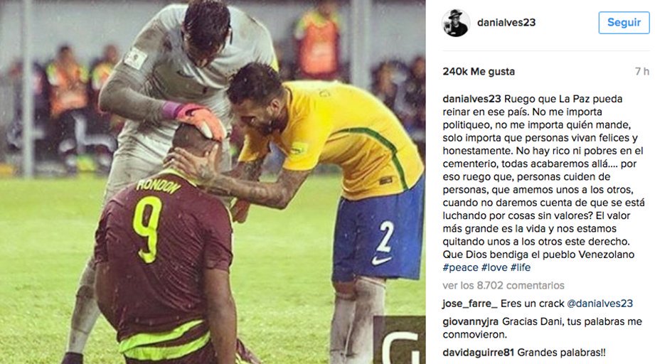 Tras la victoria de Brasil 2-0 ante la vinotinto este martes en la décima fecha de eliminatorias sudamericanas, el futbolista brasileño Dani Alves aprovecho sus redes sociales para enviar un mensaje de solidaridad con el pueblo venezolano.