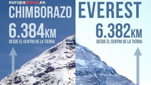 La diferencia del Chimborazo sobre la montaña más alta de la Tierra desde el mar, el Everest, es notoria, son casi 2 kilómetros de diferencia a favor de la cima ecuatoriana sobre la nepalí, de 8.848 metros sobre el nivel del mar, pero en una latitud que lo aleja del centro de la Tierra, todas las mediciones han sido obtenidas en el marco de la tercera misión geodésica franco-ecuatoriana, un equipo de investigadores franceses y ecuatorianos emprendió la ascensión del volcán Chimborazo, el pico más alto de los Andes ecuatorianos situado a unos 180 kilómetros al sur de Quito, En la línea ecuatorial, el radio desde el centro de la Tierra es 21 kilómetros mayor que desde los polos, lo que permite que la cima del Ecuador pueda aventajar a cualquier otra del mundo en lo que se refiere a distancia desde el centro de la Tierra.