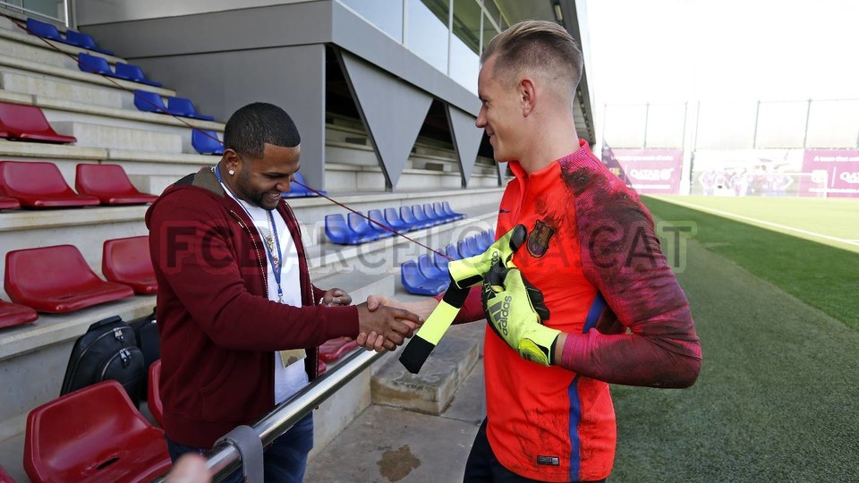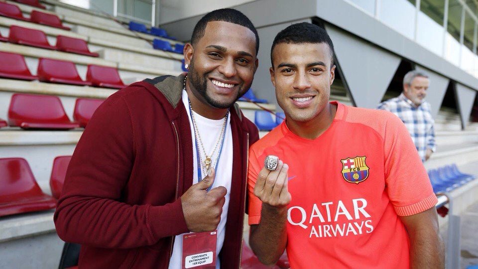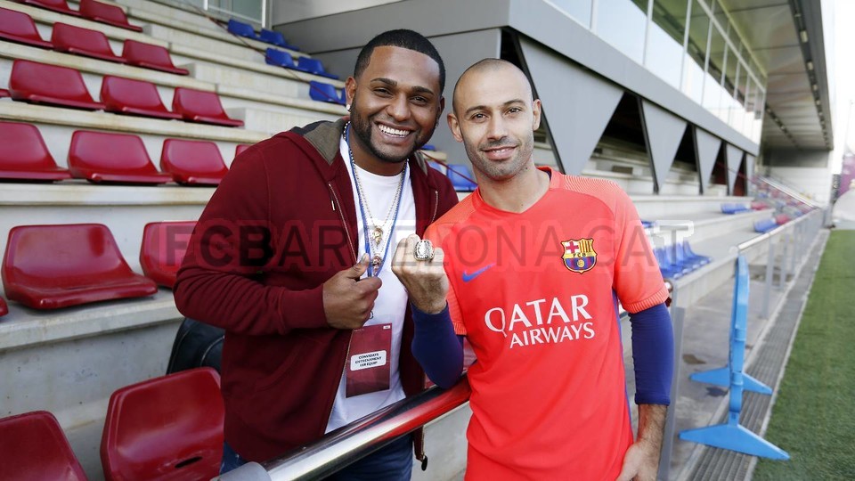 “Kung Fu Panda” compartió con los jugadores y se fotografió junto a Iván Rakitic, Sergi Roberto, Denis Suárez, Javier Mascherano, Marc André Ter Stegen, entre otros que posaron con el anillo de campeón de Serie Mundial que obtuvo el criollo con los Gigantes de San Francisco en 2012.