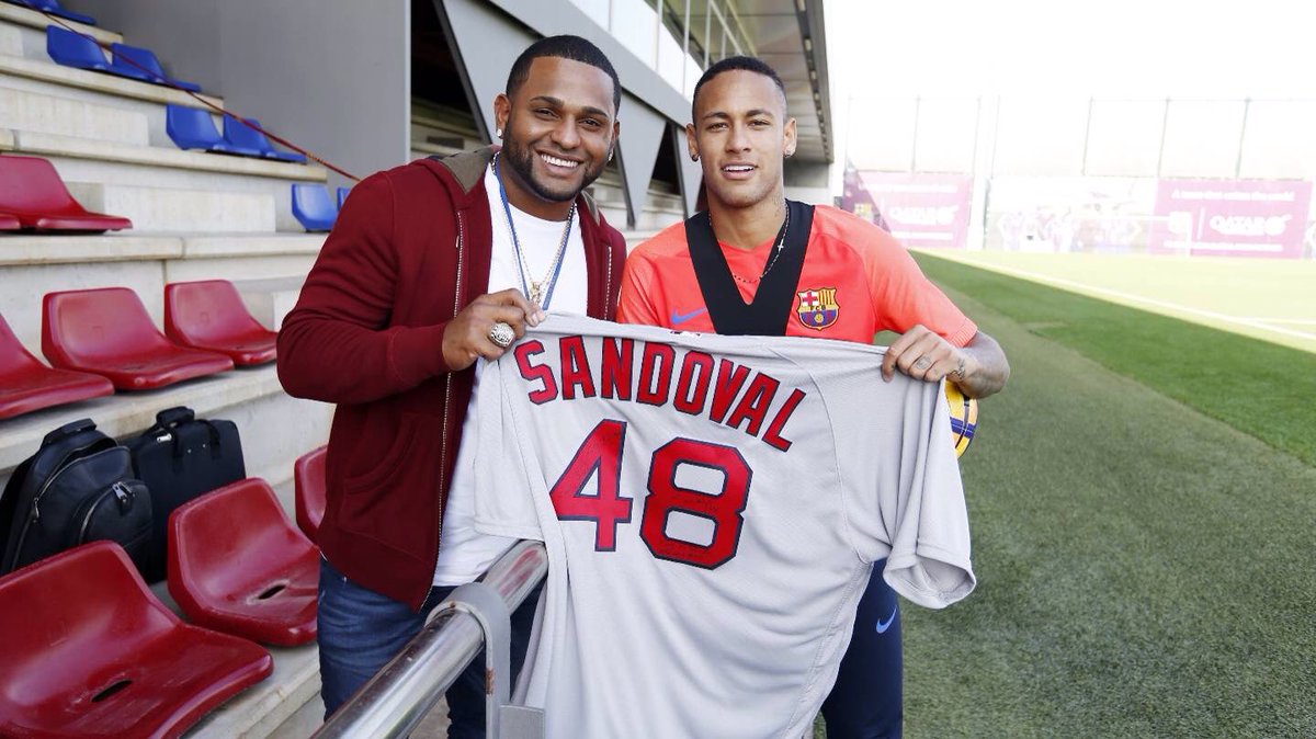 Neymar recibió como obsequio una camisa de Sandoval de los Medias Rojas con el dorsal 48.
