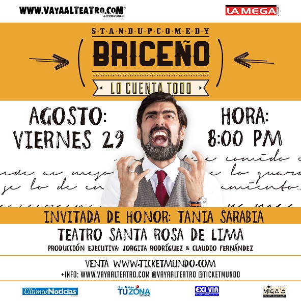 El exitoso Stand Up Comedy Briceño lo cuenta todo se presentará por primera vez en el Teatro Santa Rosa de Lima, el viernes 29 de agosto a las 8:00 pm. Las entradas cuestan entre 300 y 600 bolívares y están a la venta en www.ticketmundo.com.