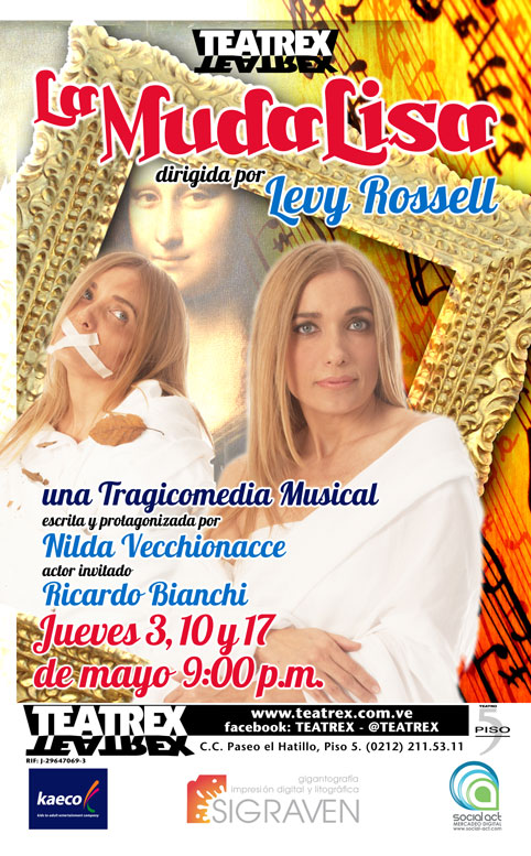 Alcanzar un gran sueño, luego de tantas vicisitudes, sin perder la fe y la esperanza, es la historia que nos muestra la gran obra musical “LA MUDA LISA” que de la mano del gran director, actor y productor de cine, teatro y televisión, Levy Rossell, se estrenará el próximo jueves 3 de mayo en el Teatrex Paseo El Hatillo. “La Muda Lisa” está escrita y protagonizada por Nilda Vecchionacce con Ricardo Bianchi como actor invitado, quienes son extraordinarios ejemplos de la actuación venezolana.