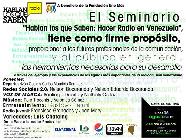 Caracas 09 de julio 2012.- La Fundación Uno Más ha reunido a importantes figuras de la radiodifusión venezolana, quienes compartirán sus experiencias en el Seminario «Hablan los que Saben: Hacer Radio en Venezuela».