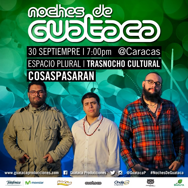 Es así como el próximo miércoles 30 de septiembre a las 7:00pm, los sonidos del rock agitarán al público del Espacio Plural del Trasnocho Cultural con la propuesta musical de Cosaspasaran. Las entradas para Noches de Guataca se encuentran ya a la venta en las taquillas del Trasnocho Cultural. Más información en la página web www.guatacaproducciones.com y en las redes sociales: @guatacap Facebook: Guataca Producciones.