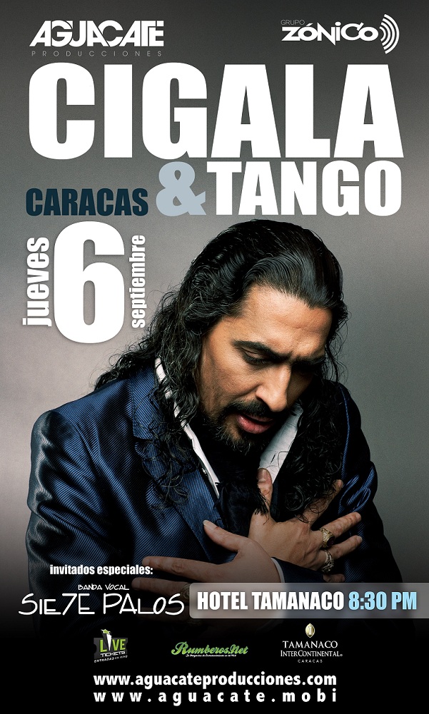 Diego ‘El Cigala’, vuelve al país con su esperado espectáculo Tour Cigala & Tango, con el que está recibiendo críticas y galardones por todo el mundo. El Hotel Tamanaco en Caracas, el Hotel Venetur Tacarigua-Valencia y en el Centro de Arte Lía Bermúdez de Maracaibo, los días 06, 07 y 08 de septiembre respectivamente, el público venezolano podrá disfrutar de manera exclusiva de un memorable concierto producido en alianza por Aguacate Producciones y Grupo Zónico.