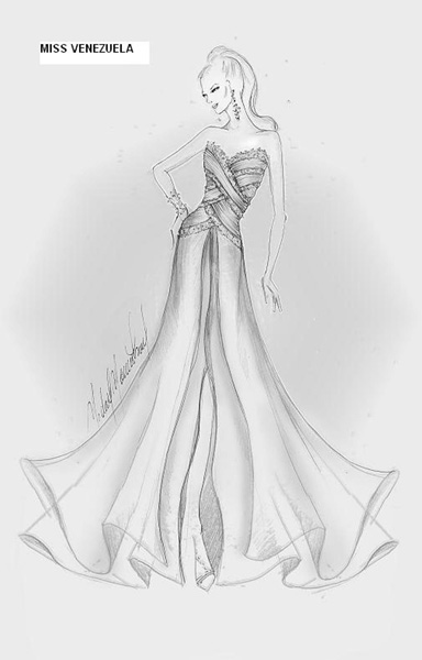 En este diseño se destaca el elaborado bustier, finamente bordado de donde se desprende piezas sesgadas que recorre a manera de cascada la esbelta figura de Miss Venezuela Elizabeth Mosquera enmarcando así la cadera y degradándose hasta la cintura en donde se prolonga una fluida cola de gaza de seda.