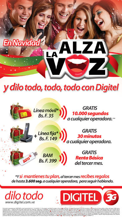 con todos. Digitel trae para esta navidad la promoción Alza la Voz, la cual otorga hasta 10.000 segundos para hablar a cualquier operadora con la compra de una línea Pre-pago o Post-pago de telefonía Móvil; así como también beneficios para la líneas de telefonía Fija y BAM. Esta promoción estará vigente hasta el 03 de enero de 2011 y tiene el objetivo de incentivar el consumo de voz con la oferta de beneficios especiales para las líneas nuevas.