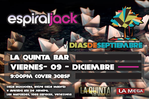 disfrutar en vivo, el día viernes 9 de Diciembre en La Quinta Bar de Las Mercedes a las 10:00pm. ESPIRALJACK compartirá tarima con DIAS DE SEPTIEMBRE = juntos nos brindarán una noche cargada de Rock y buen estilo.