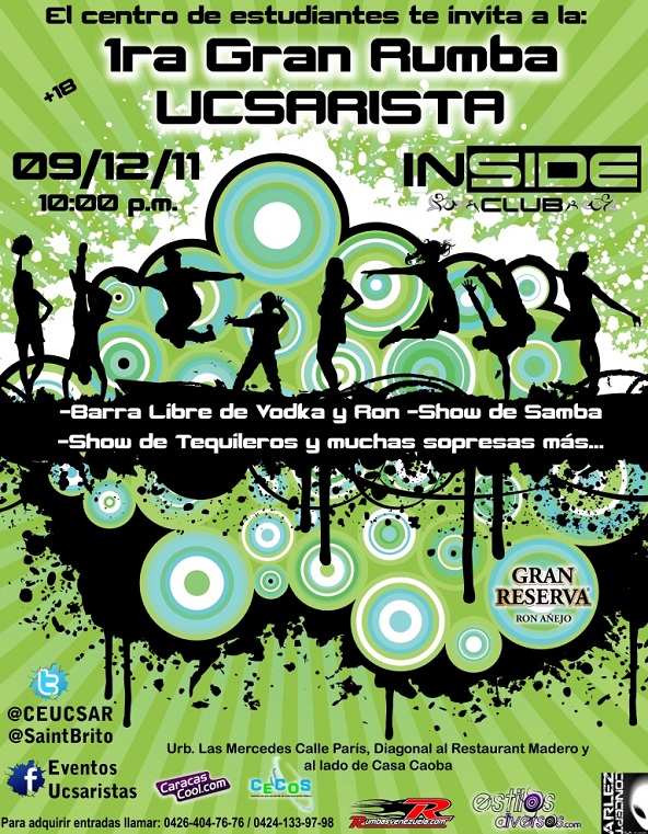 La locación elegida para esta primera fiesta es el reconocido local INSIDE CLUB, ubicado en la Calle París de Las Mercedes, el cual es reconocido por sus rumbas y su público constante que reafirma la excelencia de este local el cual cuenta con una amplia barra que garantiza el buen servicio a sus clientes, además cuenta con una excelente selección de música pensada exclusivamente en el disfrute de quienes acuden a divertirse en sus instalaciones y esa noche será exclusiva para los estudiantes de la UCSAR y sus invitados.
