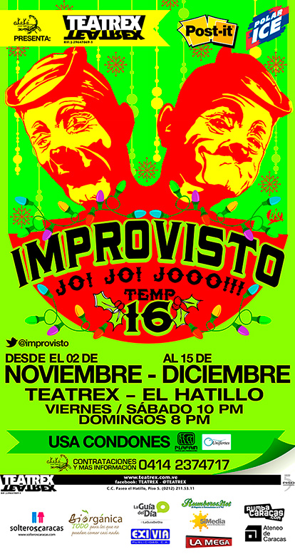 Improvisto “Especial Navideño” comienza el 02 de Noviembre al 15 de Diciembre en TEATREX, C.C. Paseo el Hatillo, los viernes y sábados a las 10:00pm y domingos 8:00pm. Las entradas podrán ser adquiridas en las taquillas del teatro y por www.teatrex.com.ve y por la taquilla del teatro, así mismo por el Call Center: (0212) 211.5311 a un costo de 160,00bsf.