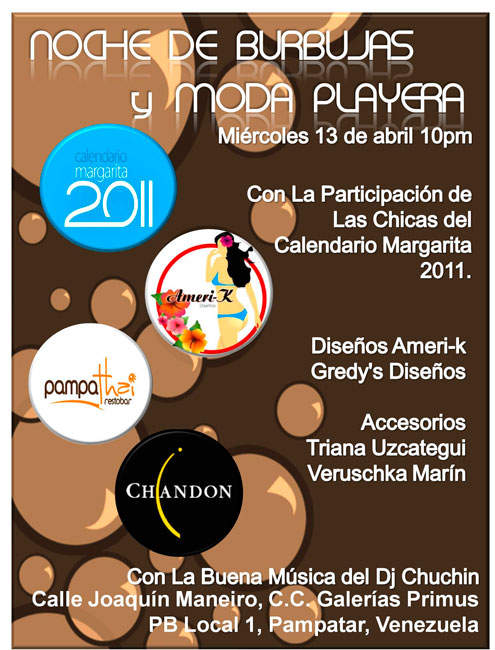Para comenzar la Semana Santa este miércoles 13 a las 10 pm. Calendario Margarita 2011, Ameri-K Trajes de Baño, Gredy´s Diseños y Pampathai Restobar