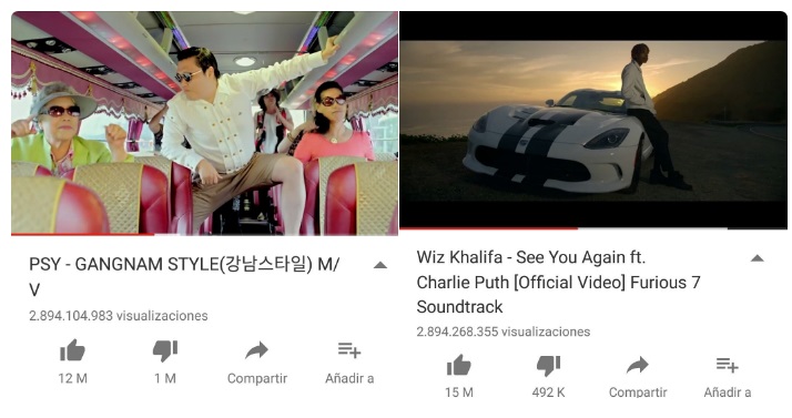 Mientras tanto, la canción viral ‘Gangnam Style’, subida al servicio en julio de 2012, hasta el momento ha sido vista 2.894 530.802 veces. El tercer video más popular de YouTube en estos momentos es el clip ‘Sorry’, de Justin Bieber, con 2.635.757.066 reproducciones.
