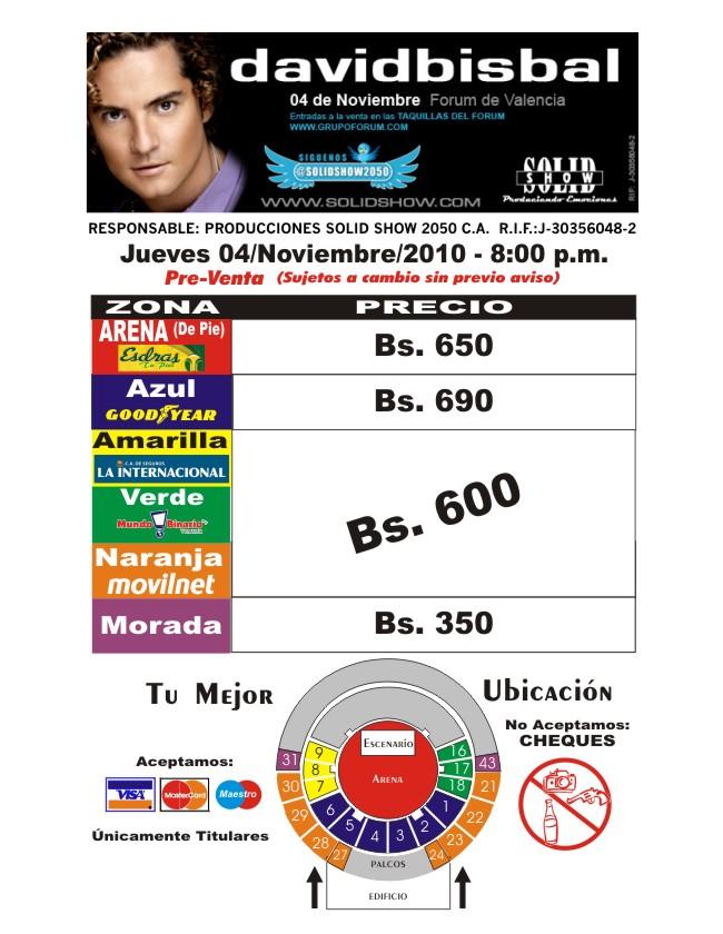 Según el portal www.grupoforum.com los precios de los boletos se distribuyen de la siguiente manera; Sillas moradas Bs 390, sillas naranja, verde, y amarilla Bs 600, las azules Bs 690, mientras que en la arena de pie Bs 650, precios que pueden variar sin previo aviso, y se pueden adquirir en las taquillas del evento. Una presentaciòn con el sello de garantìa Solid Show.