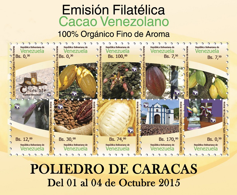 Los sellos de la serie “Cacao Venezolano 100% Orgánico Fino de Aroma”, se puso en circulación el día 01 de Octubre del 2015, están impresos en Offset, en papel engomado. Tienen un formato de 40,9 X 28,8 mm y 28.8 X 40.9 mm en pliegos de 25 efectos. Con una tirada de 220.000 efectos, cada sello varía de Bs. 0,30 a Bs. 170 valor postal de cada estampilla.
