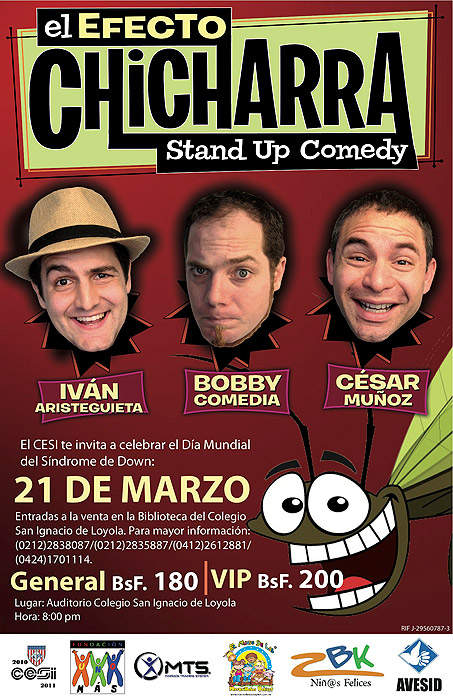 Celebrarán ¨Una Noche de Humor para el Síndrome de Down¨ Gracias a la iniciativa del Centro de Estudiantes del Colegio San Ignacio de Loyola el 21 de Marzo se llevará a cabo el Stand Comedy : Efecto Chicharra, donde los espectadores, literalmente, “se haran pipí” de la risa. El Stand Comedy de tres de los comediantes más exitosos: Bobby Comedia, Iván Aristeguieta y César Muñoz, se unieron para festejar el Día Mundial del Síndrome de Down en conjunto con la Fundación UNO MAS y AVESID